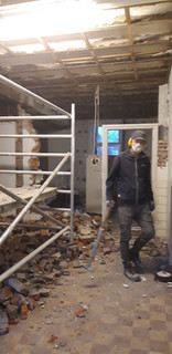 Hans is, met hulp van buurman Han, flink aan het slopen gegaan dit weekend! 't moet eerst een puinhoop (letterlijk...) worden voordat we weer kunnen gaan opbouwen. De verlaagde plafonds zijn er uit, ook al behoorlijk wat voorzet muren neergehaald. Ook de opgebouwde schoorsteen / schouw is gesloopt. Maar het meest spectaculair, de muren van de natte cel en de muur tussen slaapkamer en keuken... het begint al 1 grote ruimte te worden. Straks zal een nieuwe in-/verdeling worden ingebouwd.
